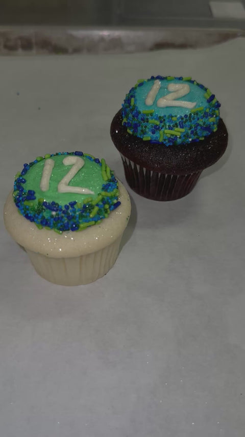 12 Cupcakes – 6 Vanilla, 6 Chocolate, with Vanilla Buttercream Frosting. Due to incredible demand we  need to update the 12 pack to: the new dozen will feature 4 12th Fan PIPED 12's topped of with Glitter & 8 Football sugar toppers. GO HAWKS!